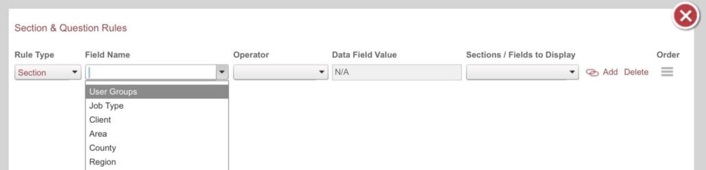When setting up the rules against a data collector, a ‘User Groups’ section is available in the ‘Field Name’ dropdown. This will include all user groups that exist for the client. If no user groups have been configured, the ‘User Groups’ section will not be shown.