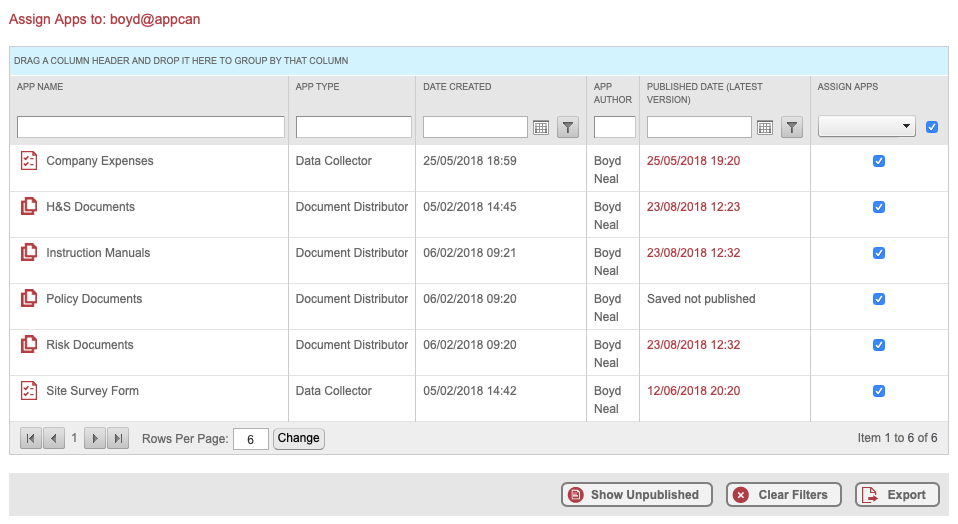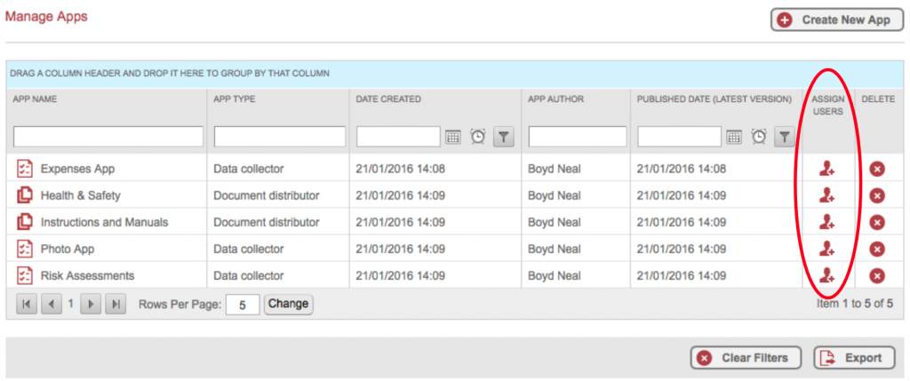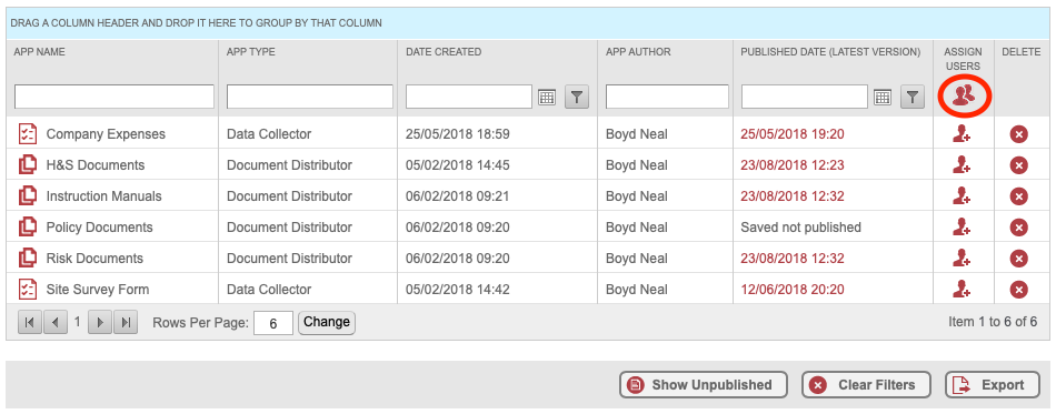 To assign or unassign users from an app, click the icon next to the required app in the ‘Assign Users’ column. This will popup a grid with the list of users.