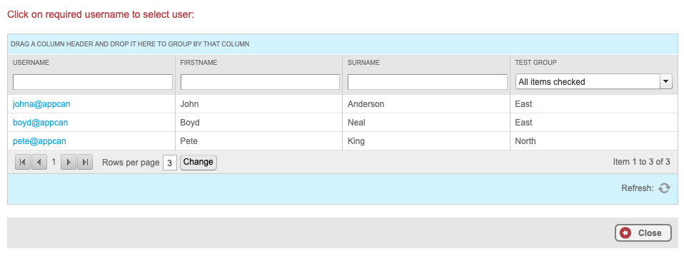 You will then be shown a list of available users. Within the grid, you can apply filters to show only a subset of users.