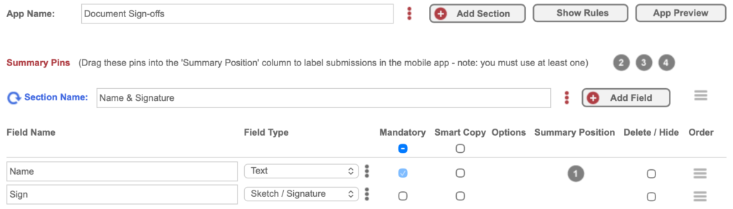 Within a section, you can now apply Select All for both Mandatory and Smart Copy field settings, rather than ticking each field individually. This saves time when configuring sections with many fields.